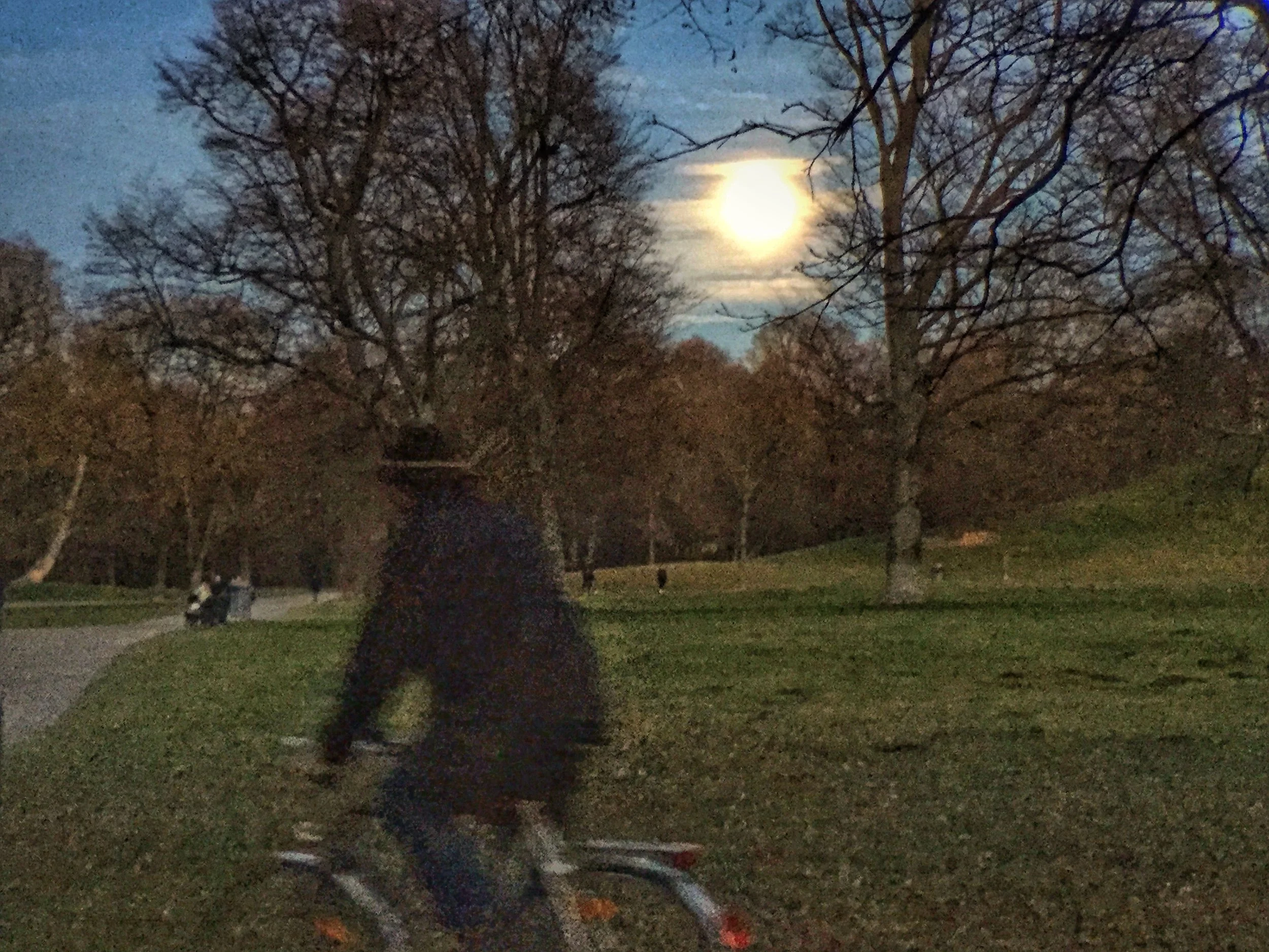 We listened to some street musicians, and watched the moon rising over the city. On the way back we biked through the English Garden, Munich’s central park, experiencing the holy night settling in, watched by thousands of crows hanging out in the empty trees.