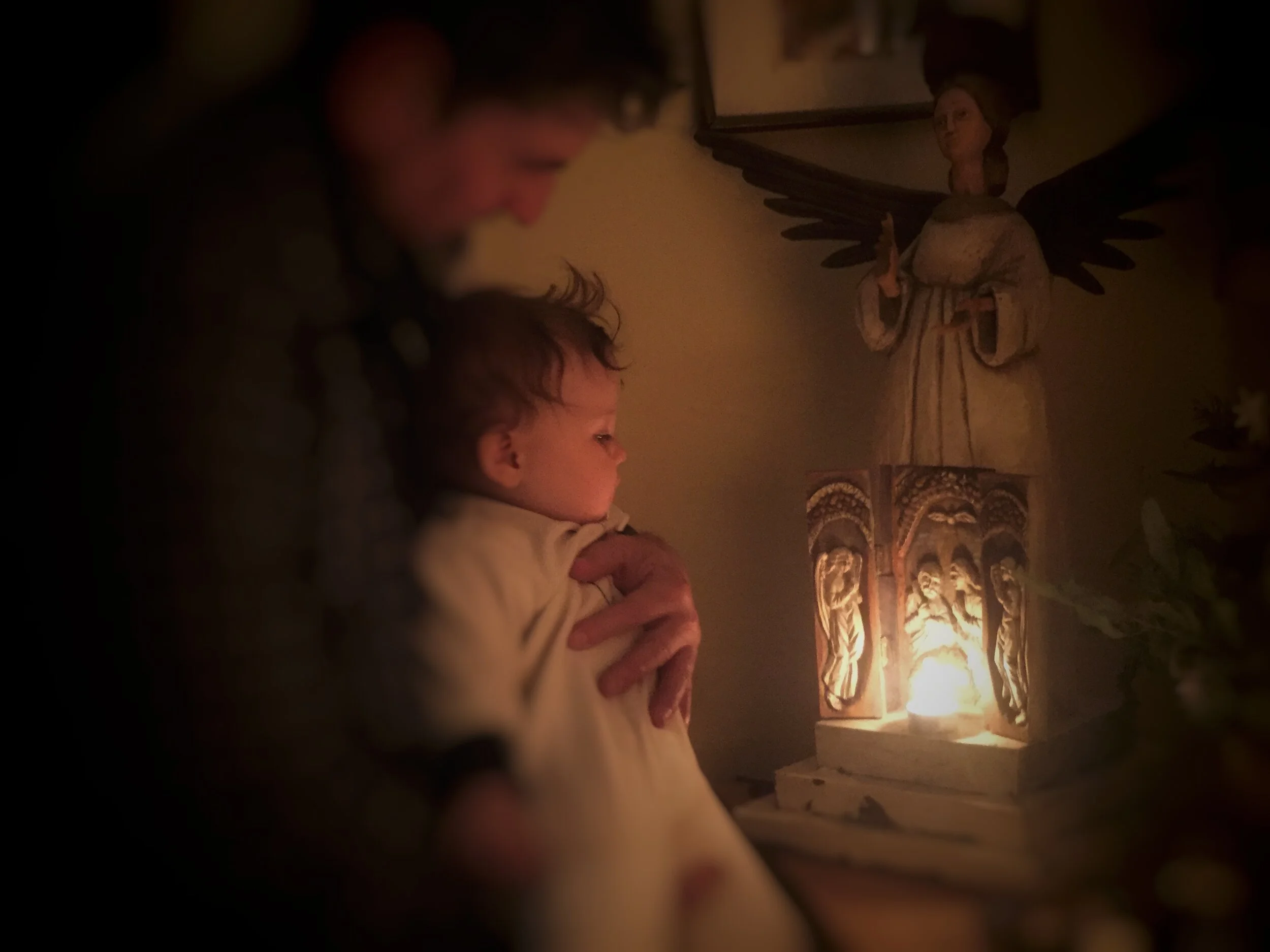 Now that we are experiencing late parenthood, we are discovering a third approach to ritual; simple joyful presence to the repetition and to the experience. Hannah, our 21 month old, loves ritual. She loves doing rituals with us. She insists we pray before meals and that we light candles at meals. In the morning and throughout the day she polices the candles on our house altar. When they go out, she runs to get us and point to them, saying “On!” We have a statue of Mary from St. John’s Abbey on our altar, and Hannah now identifies Mary (“Mi-ma!”) in many nativity scenes.