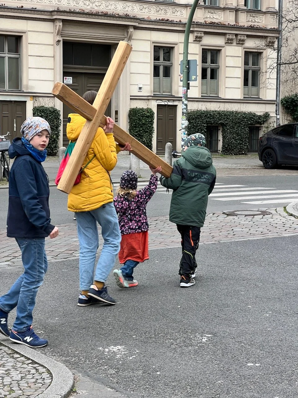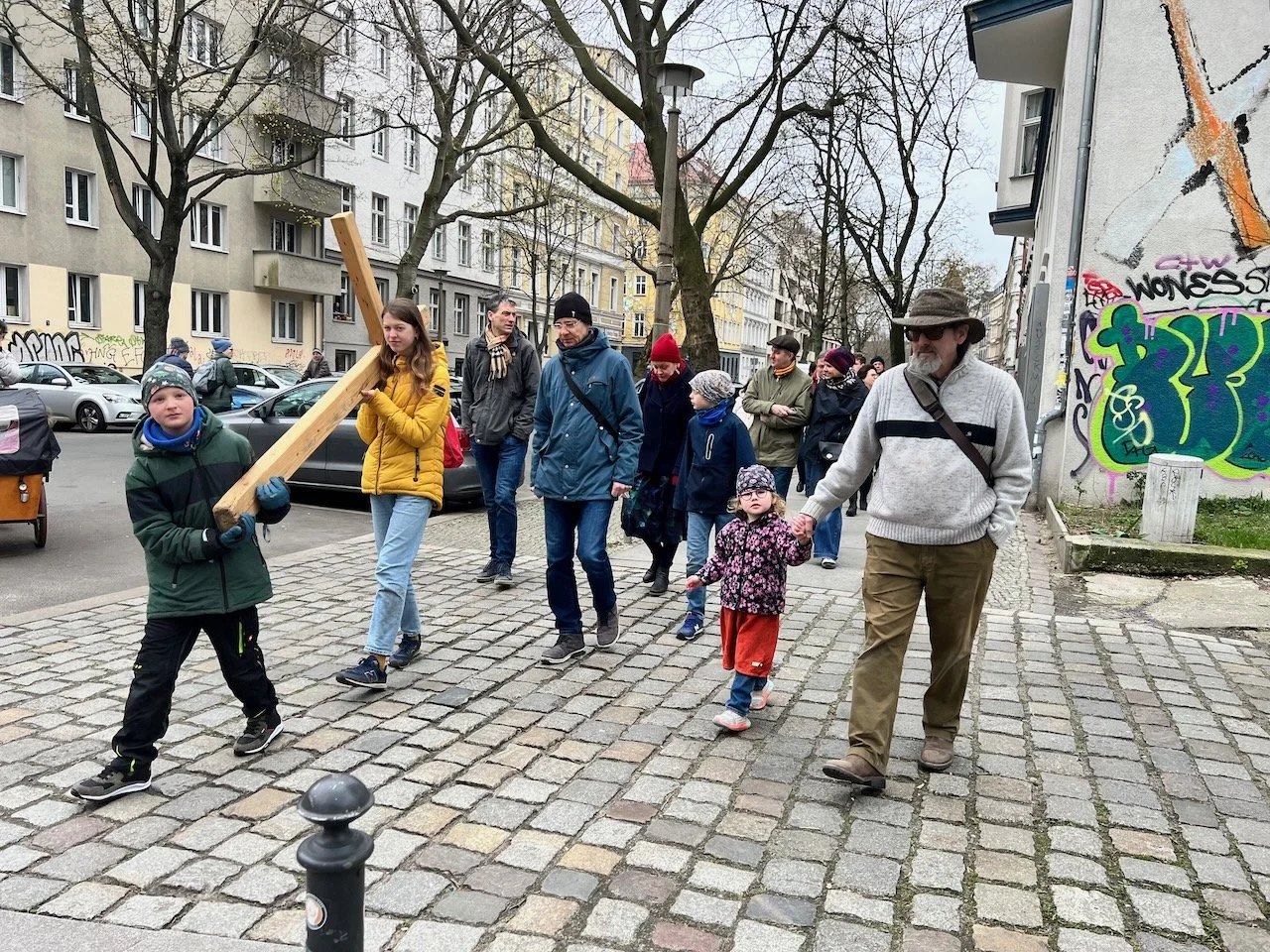 Carrying the cross through the streets of Berlin, Germany across church yards and playgrounds all the way towards Reconciliation Church right at the memorial park where the Berlin Wall once stood.
