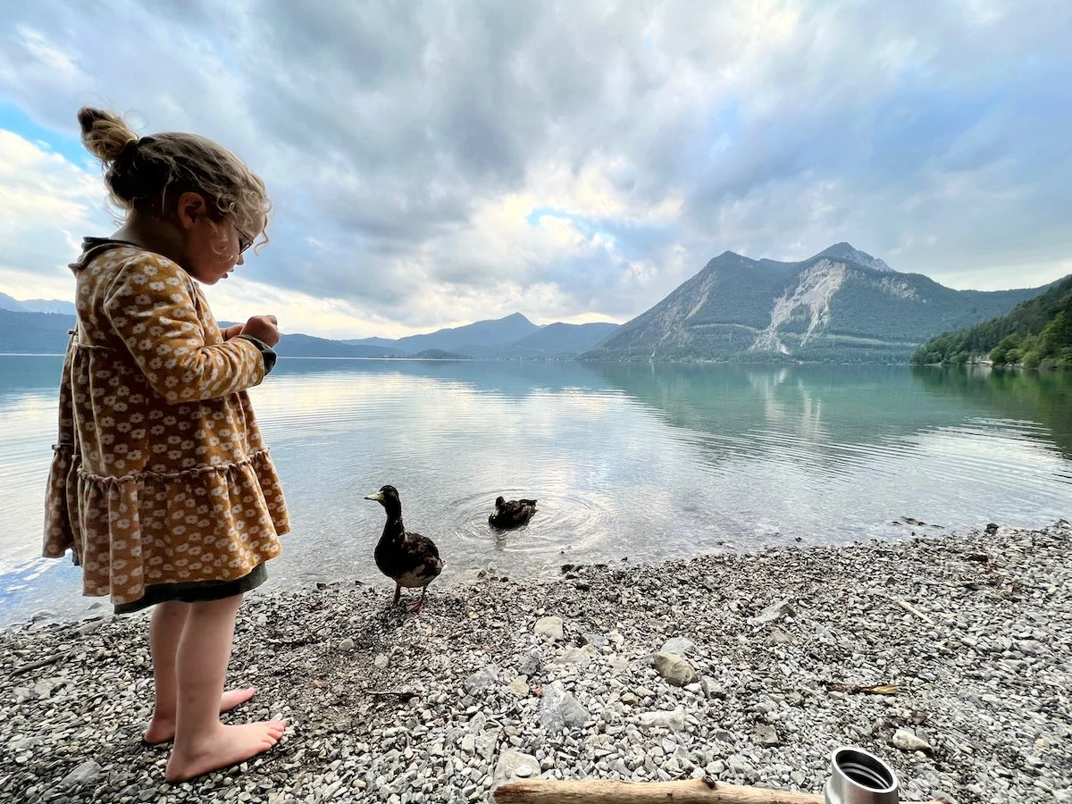 Halfway in, there was indeed a view! A steep cliff opened up in front of us and I clutched Hannah’s hand tighter. Before us a blue lake shimmered and stretched towards the horizon, on one side, the mountain tops of the Bavarian Alps and on the other the rolling blue-green foothills. And the translucent sky and clouds reflected in it. We held our breath. We decided to declare victory and took in our reward. It was worth the sweat and strain. What ever else comes now is just for the fun of it.