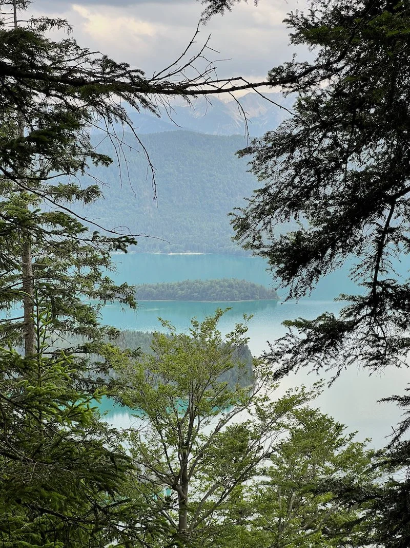 The view! Kochelsee shimmering through the trees.